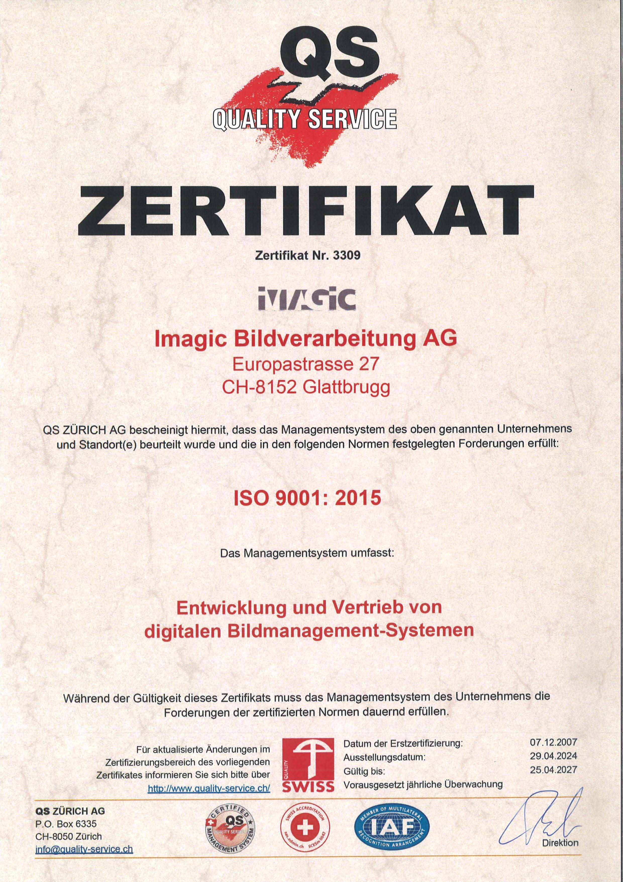 Imagic ist bezüglich aller internen und externen Arbeitsprozesse, vom Vertrieb über den Kundensupport, die interne Administration und Qualitätssicherung bis hin zur Entwicklung gemäß den Richtlinien von ISO 9001: 2015 zertifiziert.
