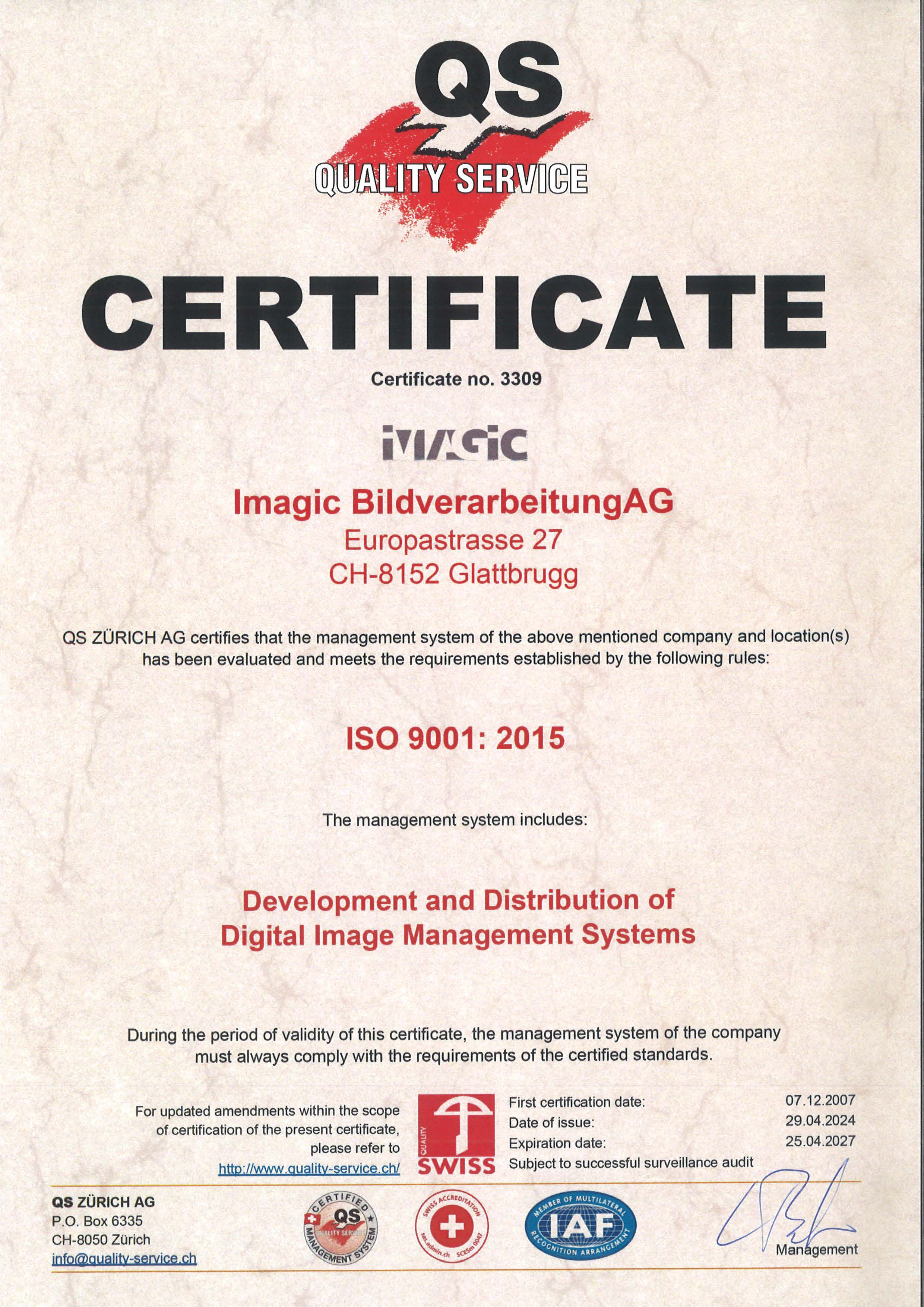 Imagic is certified according to the ISO 9001: 2015 guidelines for all internal and external work processes, from sales through customer support, internal administration and quality assurance to development.